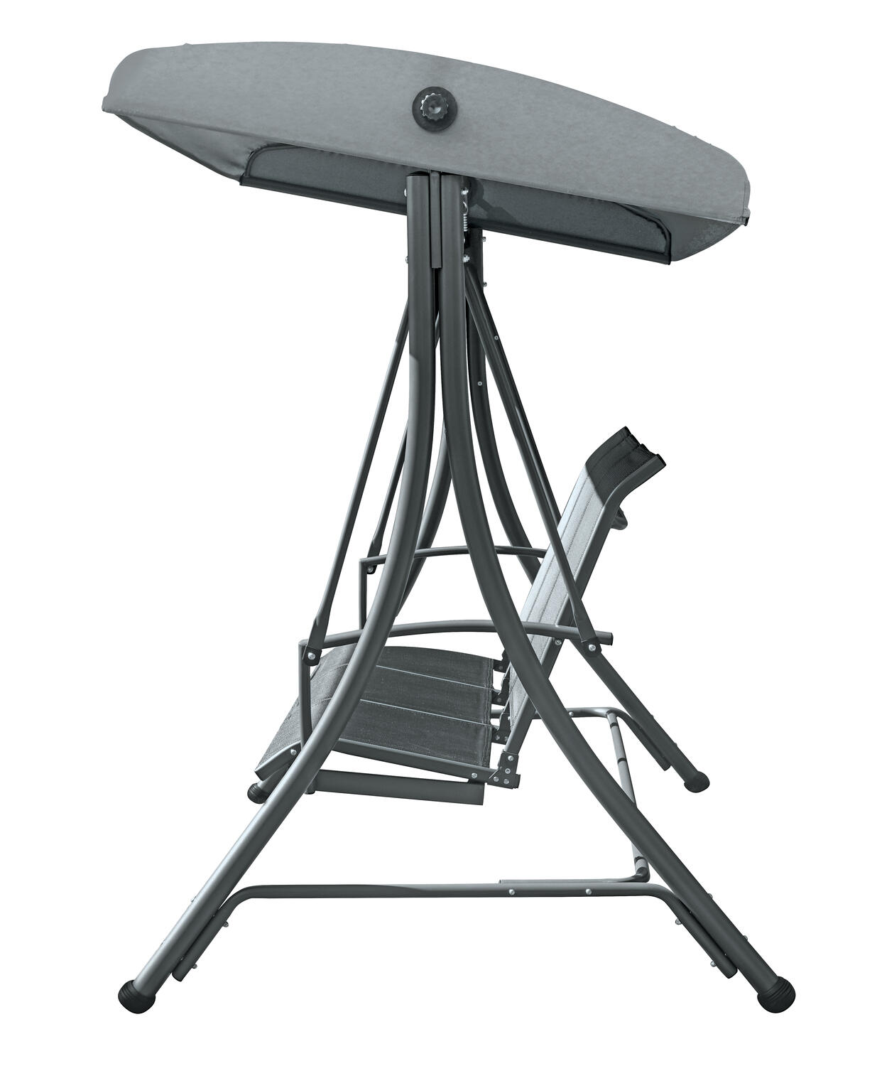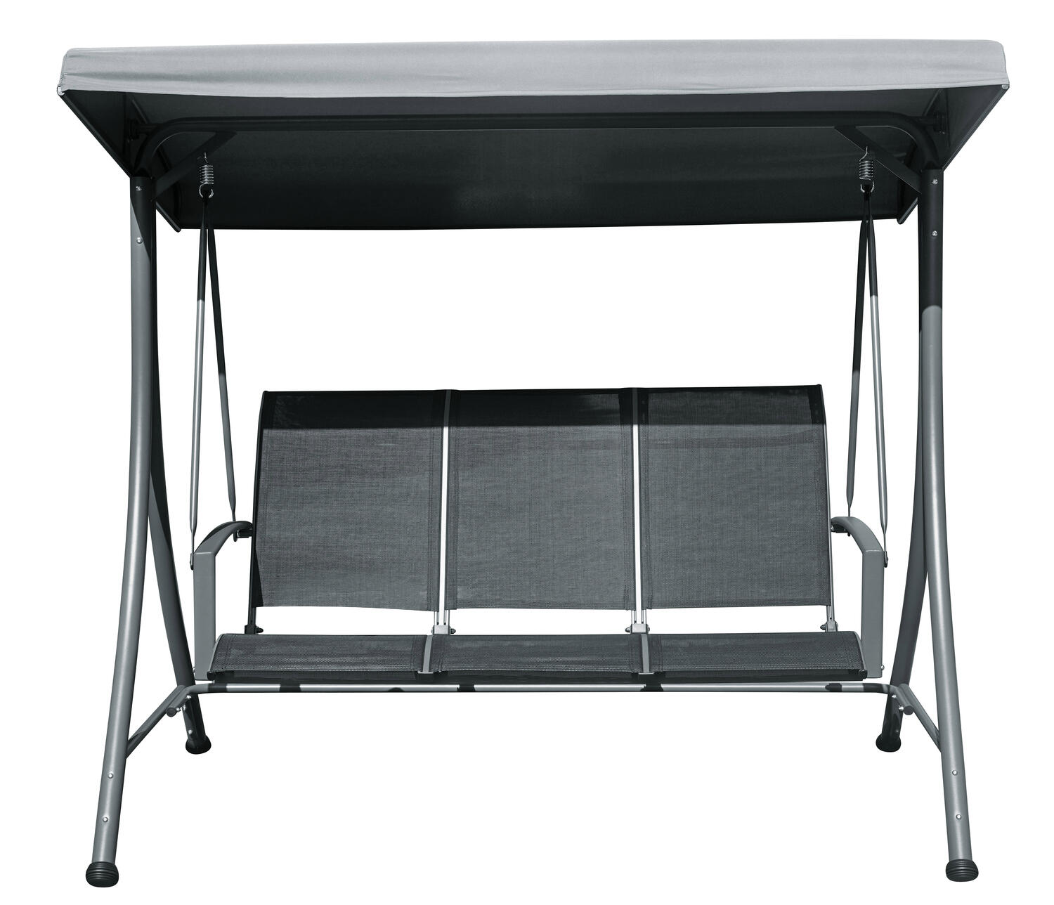 Dondolo a tre posti con struttura in ferro ANTRACITE. Seduta in textilene color GRIGIO, tettuccio in poliestere color GRIGIO.