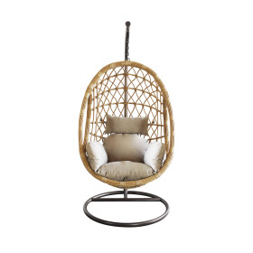 Poltrona sospesa dondolante in polyrattan spazzolato con morbidissimo cuscino imbottito color sabbia per creare una zona relax dal comfort ottimale.
