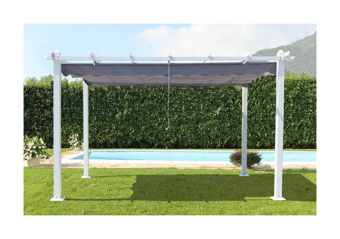 Colore della struttura tortora lucido La copertura è scorrevole in modo da poter essere chiusa in caso di vento forte oppure durante l'inverno quando non si utilizza il gazebo