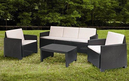 Salotto in resina plastica effetto rattan di colore grigio composto da divano da 3 posti completo di poltrone e cuscini.