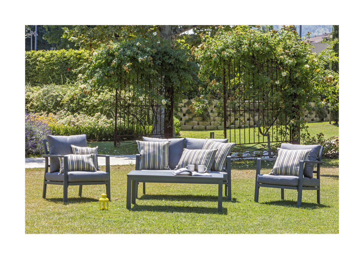Salotto da giardino in alluminio composto da due poltrone, un divano due posti e un tavolino rettangolare. Il set è disponibile nei colori antracite e tortora con cuscini abbinati in grigio o sabbia.