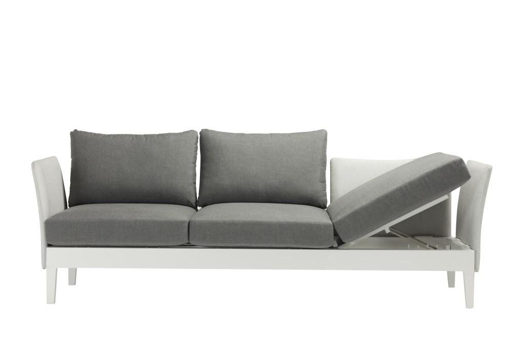 Set in alluminio verniciato in bianco polvere. Fianchi e schienale in Textilena Grigio Melange. I comodi cuscini sono in grigio chiaro. Il divano è adatto per sdraiarsi perché ha la regolazione del poggiatesta su un cuscino in 5 posizioni. Il set è adatto per interni ed esterni.