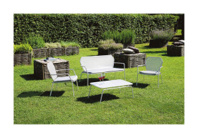 Set da giardino composto da 2 poltrone impilabili, 1 divano ed 1 tavolino
