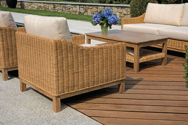 Linee moderne e pulite per il salotto da giardino Maiori di GREENWOOD. Design contemporaneo e materiali caldi come il legno ed il rattan naturale fanno di Maiori il salotto perfetto per arredare la zona relax del giardino o della terrazza. Il set da giardino è composto da un divano e due poltrone completi di comodi cuscini sfoderabili in policotone ecrù e un tavolino in legno.