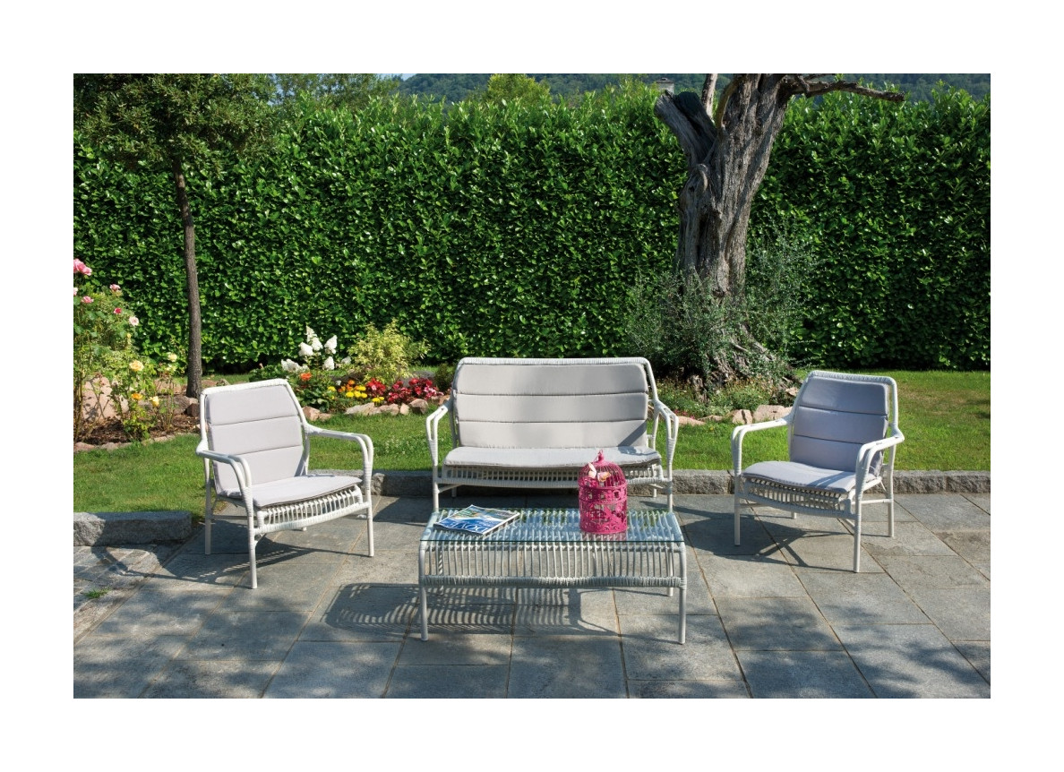 Set mobili da giardino composto da: 2 poltrone - 1 divano - 1 tavolino 100 x 50 x 39 cm. Wicker da 12 mm color milk, piano in vetro, cuscini grigi. Dimensioni: Poltroncine: L 70 cm - A 79 cm - P 69 cm.Divano: L 130 cm - A 79 cm - P 69 cm. Tavolo: L 100 cm - A 39 cm - P 50 cm.
