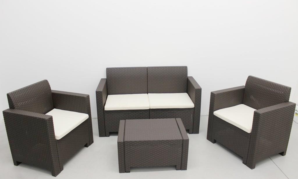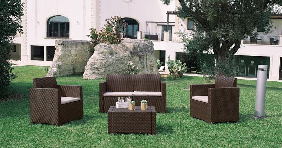 Salotto giardino da esterno in rattan sintetico stampato in polipropilne.