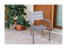 Poltrona impilabile, struttura in alluminio verniciato col. TAUPEsemiopaco, schienale e seduta a doghe in polywood col. grigio