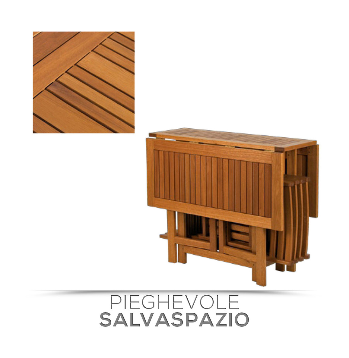 Tavolo pieghevole 90?90 cm: occupa poco spazio quando chiuso e ospita comodamente fino a 4 persone.