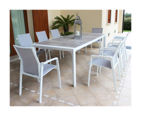 • Questa particolare linea di tavoli da esterno è caratterizzata da un incredibile piano in gres, materiale ceramico a pasta compatta impermeabile, inattaccabile dagli agenti chimici, resistente all'usura e alle intemperie.Oltre alle caratteristiche sopra citate, offre un design estremamente moderno e contemporaneo con un effetto legno estremamente fedele, la struttura è realizzata interamente in alluminio verniciato.