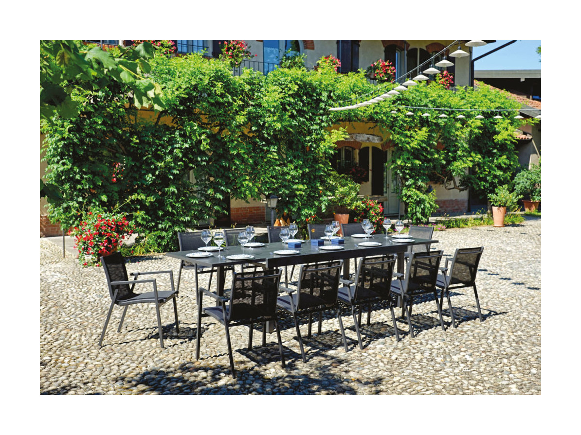 Tavolo allungabile Montepulciano 135/270 X 105 cm. Struttura in alluminio color antracite. Piano a doghe. Sedie non incluse.