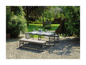 Dining Set Villasimius in wicker intrecciato color grigio. Struttura in ferro , cuscini color tortora sfoderabili. Composto da 2 panche 146 x 39 cm e 1 tavolo 160 x 90 cm.