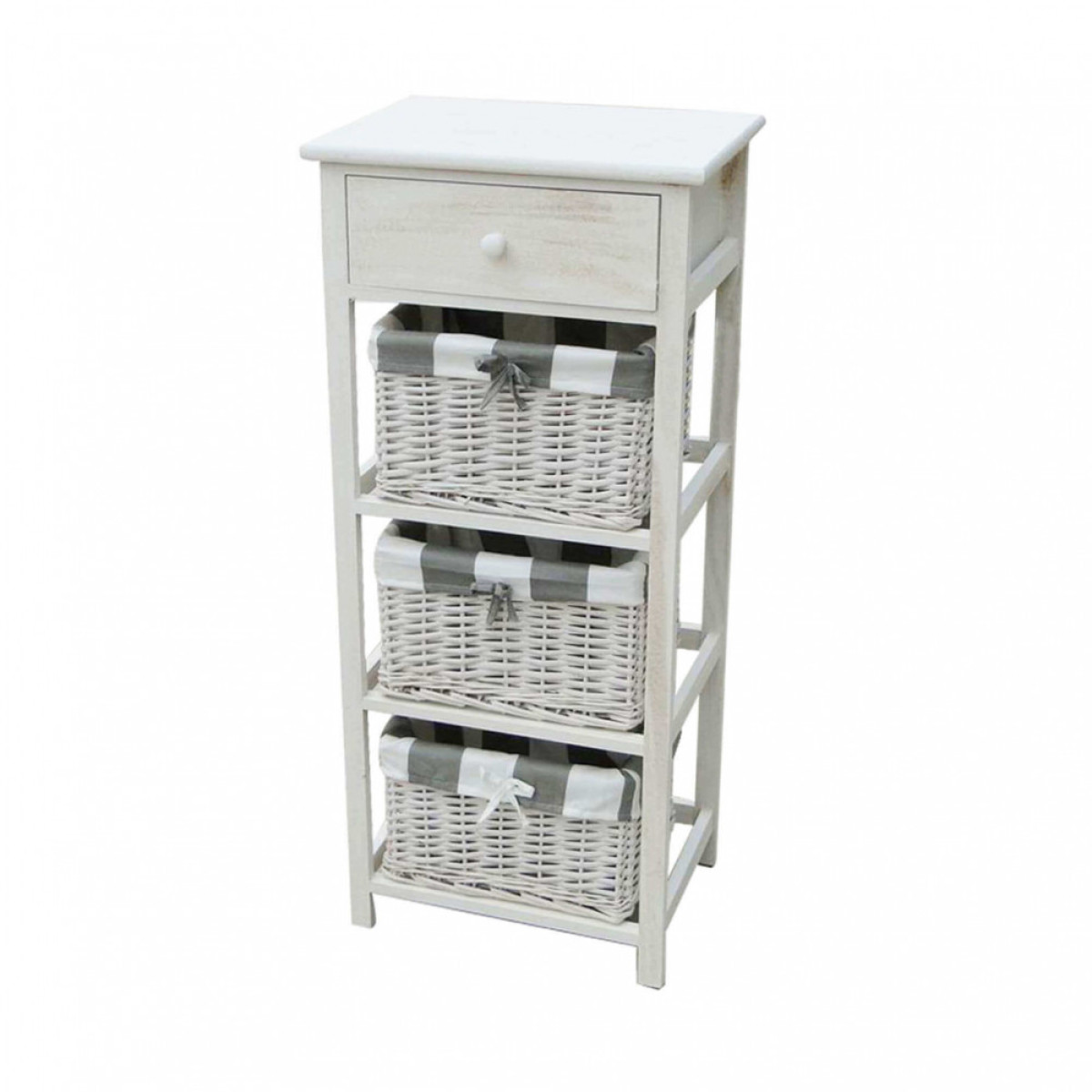 struttura in legno di paulownia bianco 1 cassetto in legno colore bianco, 3 cassetti in salice colore bianco e rivestimento in tessuto rigato dimensioni: cm 40 x 29 x 90 h