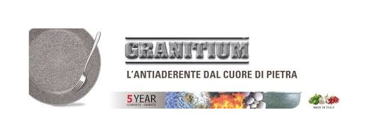 La sua superficie di cottura è realizzata con piccole particelle di pietra unite che la convertono nella padella più resistente del mercato. Granitium si riscalda rapidamente e mantiene il calore per più tempo.La superficie in pietra è dieci volte più resistente e dura dieci volte più a lungo dei normali rivestimenti antiaderenti.Quindi non brucia non scolorisce e non si squama.La padella Granitium è perfetta perché può raggiungere alte temperature.E? la migliore padella in assoluto. Esalta il vero sapore del cibo. Con Granitium potete cucinare molluschi frutti di mare cozze ostriche? senza il rischio di rovinarla. Potete anche usare un cucchiaio di metallo senza graffiarla.Potrete cucinare in modo più salutare infatti non occorre aggiungere olio o altri grassi.Con le normali padelle i succhi naturali del cibo fuoriescono e rimangono in superficie.Granitium cuoce il cibo esternamente mantenendone i succhi all?interno. Così la carne e il pesce sono più teneri succosi e gustosi. Le verdure sono più croccanti e cotte alla perfezione.?