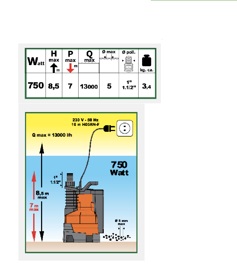 Utilizzo per acque pulite con galleggiante integrato ? Dimensione pompa 16,1?23,6?29,8 cm., quindi la dimensione minima del pozzetto potrà essere 16,5?24 cm. ? Altezza max 8,5 mt. ? Profondità max 7 mt. ? Dimensioni particelle max. 5 mm. ? Diametro uscita: ? 1?-1 1/4?-1 1/2? ? Con valvola di non ritorno ? Cavo da 10 mt.