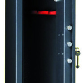Struttura in acciaio speciale - Sostegni per canna di fucile - Fori di ancoraggio a muro o a pavimento (4+2) - Fornito con rastrelliera a 5 posti - Tesoretto interno a chiave - Spessore porta 3 mm.