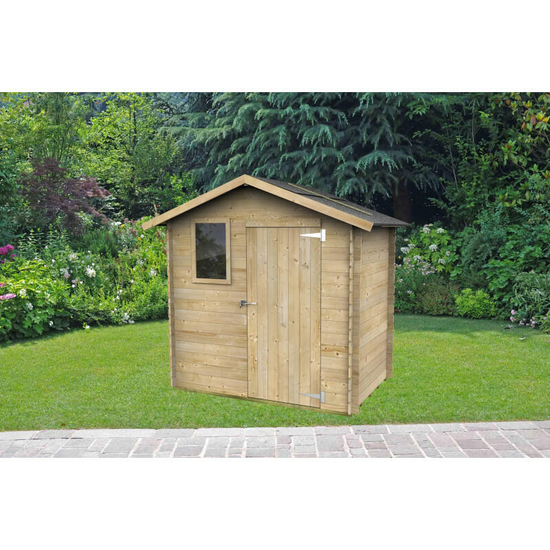 La casetta da giardino Livia è interamente realizzata utilizzando pannelli in legno di pregiato abete rosso nordico. Inoltre, per il tetto e il pavimento sono stati impiegati pannelli OSB, dello spessore di 12mm, estremamente versatili e resistenti e a basso impatto ambientale. A conferire maggiore stabilità alla struttura, contribuiscono il sottopavimento, i cui listelli sono stati impregnati in autoclave, per proteggere il legno dall?azione degli agenti atmosferici e l?armatura di rinforzo delle pareti, anch?essa realizzata utilizzando il legno di abete. Quest?ultimo è consegnato grezzo e non trattato, dunque è altamente consigliato verniciarlo dopo il montaggio con un trattamento impregnante protettivo, neutro o del colore che preferite. Il tetto invece, è dotato di una guaina bituminosa ardesiata dello spessore di 3mm, che ne garantisce l?impermeabilità. Potrete dunque conservare i vostri attrezzi tranquillamente all?asciutto nella casetta, a cui si accede attraverso la porta a singolo battente, (71x160cm), che si chiude per mezzo di un chiavistello. La casetta da giardino Livia è dotata infine di una finestra fissa in plexiglas, che oltre a costituire un elemento di decoro, ne garantisce l?illuminazione all?interno.