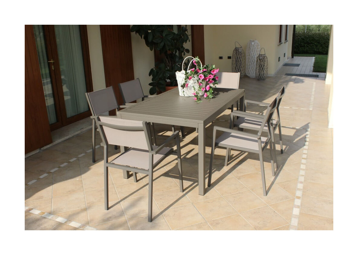 • Progettato per uso esterno questo tavolo da pranzo è perfetto per ogni tipo di patio, giardino o veranda. La sua struttura a stecche è robusta grazie all'alluminio verniciato a polvere, facile da pulire, il materiale plastico del piano è completamente riciclabile e durevole nel tempo.