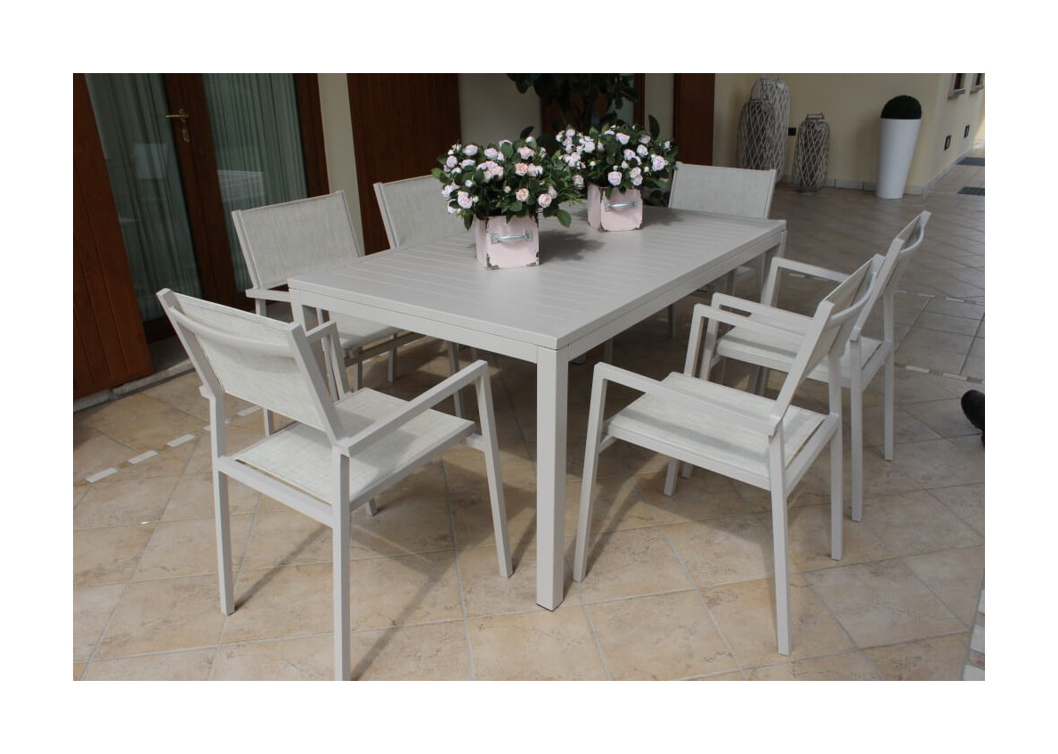 • Progettato per uso esterno questo tavolo da pranzo è perfetto per ogni tipo di patio, giardino o veranda. La sua struttura a stecche è robusta grazie all'alluminio verniciato a polvere, facile da pulire, il materiale plastico del piano è completamente riciclabile e durevole nel tempo.