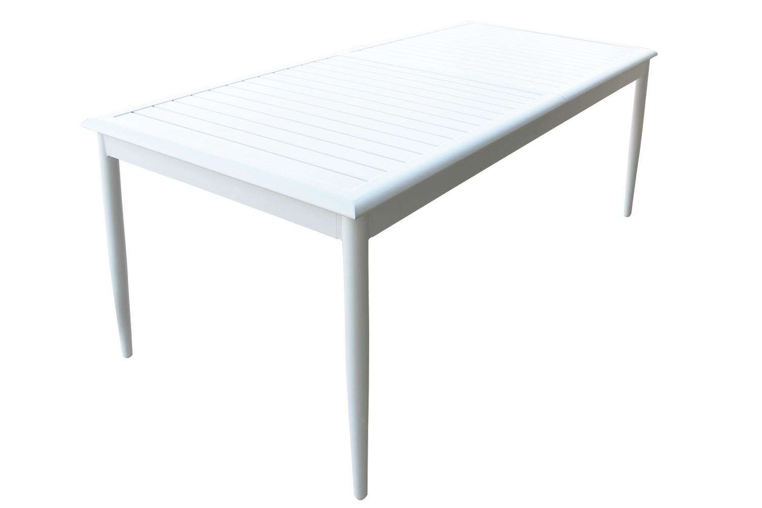 Materiali resistenti come l'alluminio sono alla base di questo tavolo rettangolare da giardino. La struttura, in resistente alluminio colore bianco, sostiene un piano d'appoggio a doghe .