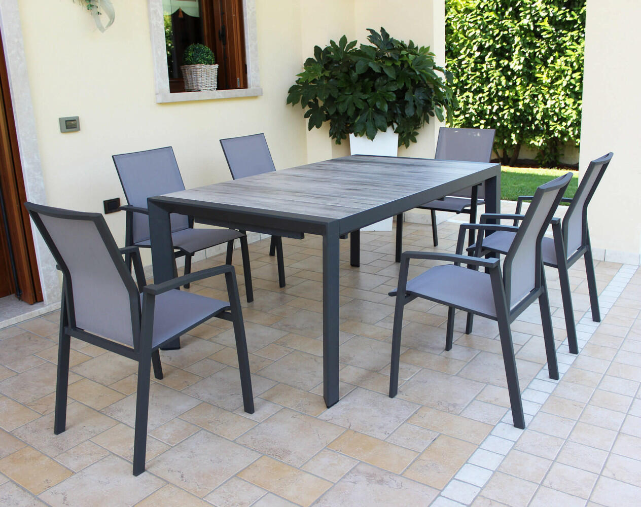 La struttura in alluminio verniciato a polvere epossidica garantisce la massima durabilità nel tempo e l'elegante piano in gress grigio tortora effetto legno dona un tocco di raffinatezza all'ambiente circostante.