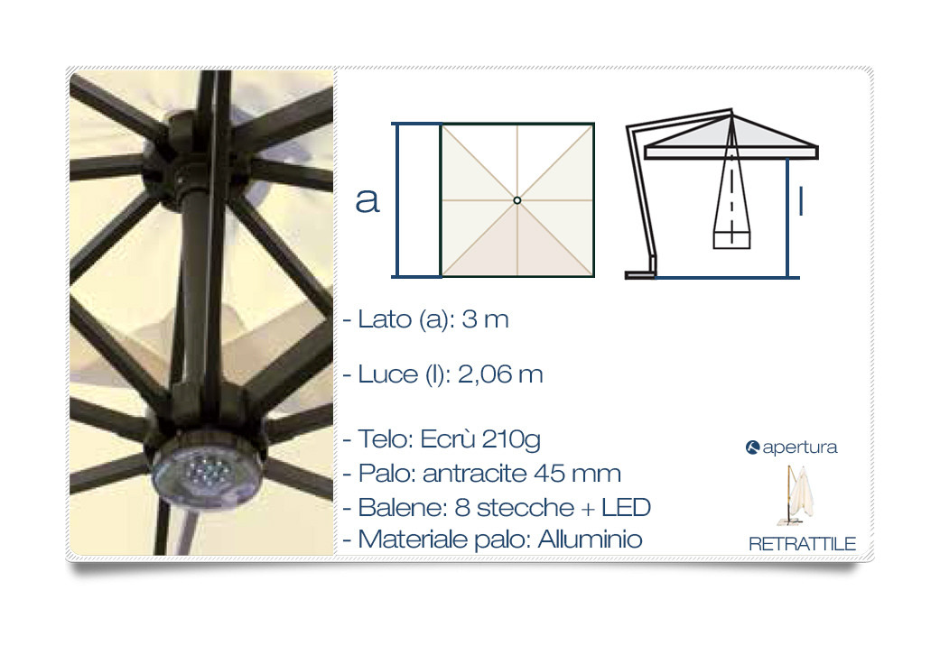 Ombrellone LED 300x300 a braccio retrattile fusto alluminio antracite