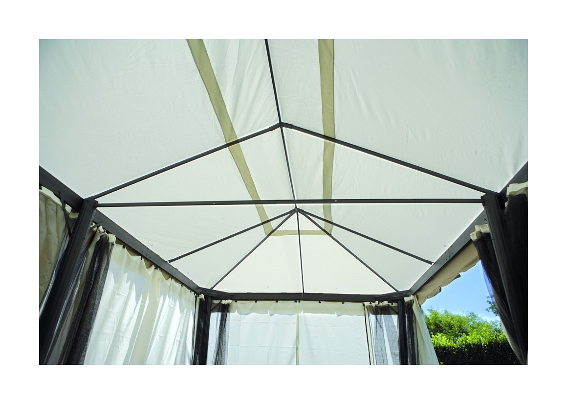 Gazebo in alluminio ? 100 mm verniciato epoxy antracite con tende laterali e copertura in poliestere resinato 350 gr. ecrù con volante biscotto.
