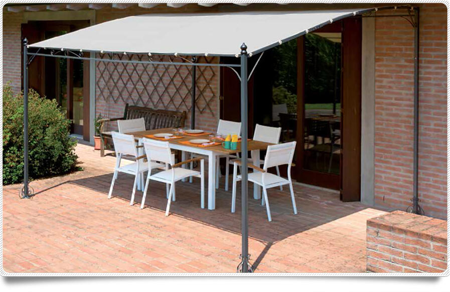 Il gazebo a pergola è, caratterizzato da una struttura in ferro verniciato cm 250x300 con telo idrorepellente in poliestere da 180g/mq, ideale per coprire un ampio spazio aperto.