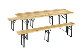 Set birreria in legno di pino composto da un tavolo 220 x 80 x 75 cm. e due panchine richiudibili con ganci di sicurezza a tre gambe in metallo per una maggiore stabilità e sicurezza di seduta.