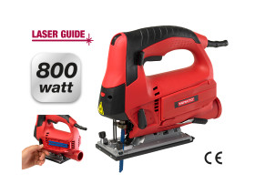 Caratteristiche: Guida laser - Base in alluminio con funzione di rilascio rapido - Attacco rapido lama - Velocità variabile - Funzione pendolo (4 posizioni) - Capacità di taglio 11 mm. legno, 10 mm. ferro - Dotazione: 6 lame stock sulla macchina