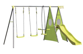 STRUTTURA IN ACCIAIO VERNICIATO A POLVERE EPOSSIDICA. SEDUTE, ALIANTE, SCIVOLO IN PLASTICA. ASTA ORIZZONTALE ?50mm. GAMBE ?45mm. 2 SEDUTE. 1 ALIANTE. 1 SCIVOLO (LUNGHEZZA 1,78m). CORDA IN PE, ?10mm. 1 CANESTRO BASKET. PANNELLI LATERALI SCIVOLO IN POLYESTERE (180 G/M²), PIANO IN LEGNO. PRODOTTO DA ASSEMBLARE. CAPACITA' MASSIMA ALTALENA: 50KG, CAPACITA' MASSIMA CAVALLUCCIO SCIVOLO E CAVALLUCCIO: 35KG ETA': 3-12 ANNI