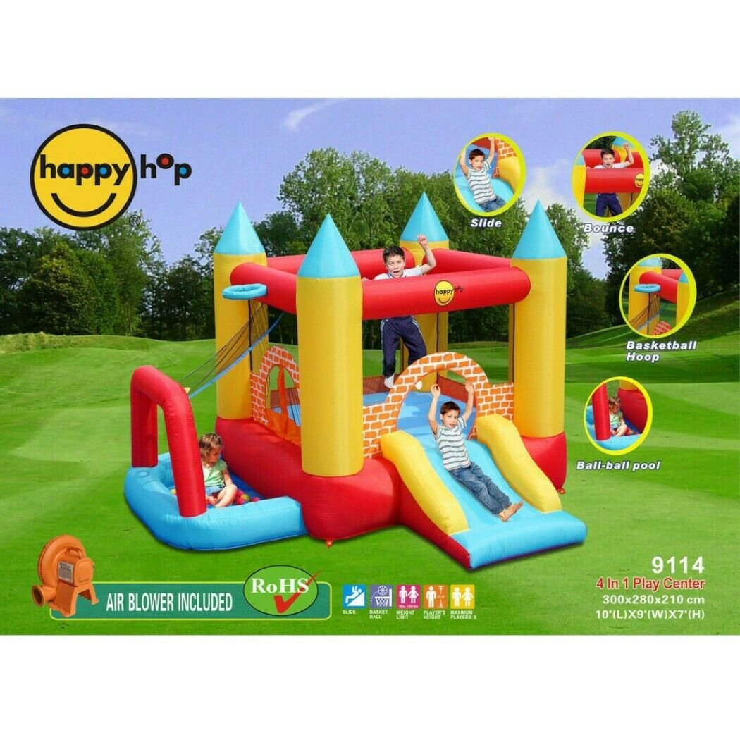 Area di gioco gonfiabile 4 in 1 per bambini, con funzioni trampolino e scivolo per il pieno di sensazioni. Dimensioni 300 x 280 x 210 cm. Installazione molto veloce (pochi minuti min) e senza sforzo (consegnato con soffiatore permanente). Massima sicurezza: reti laterali di protezione ? e sistema di ancoraggio al pavimento (4 punti). Fino a 3 giocatori simultanei.