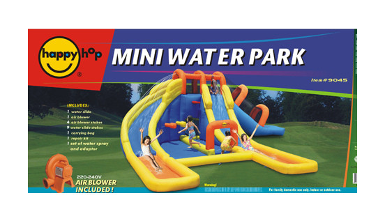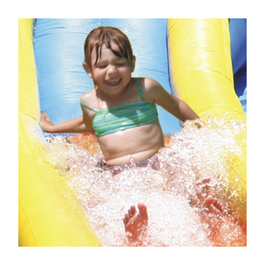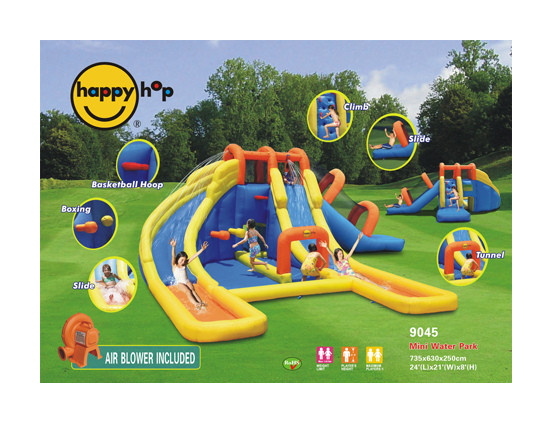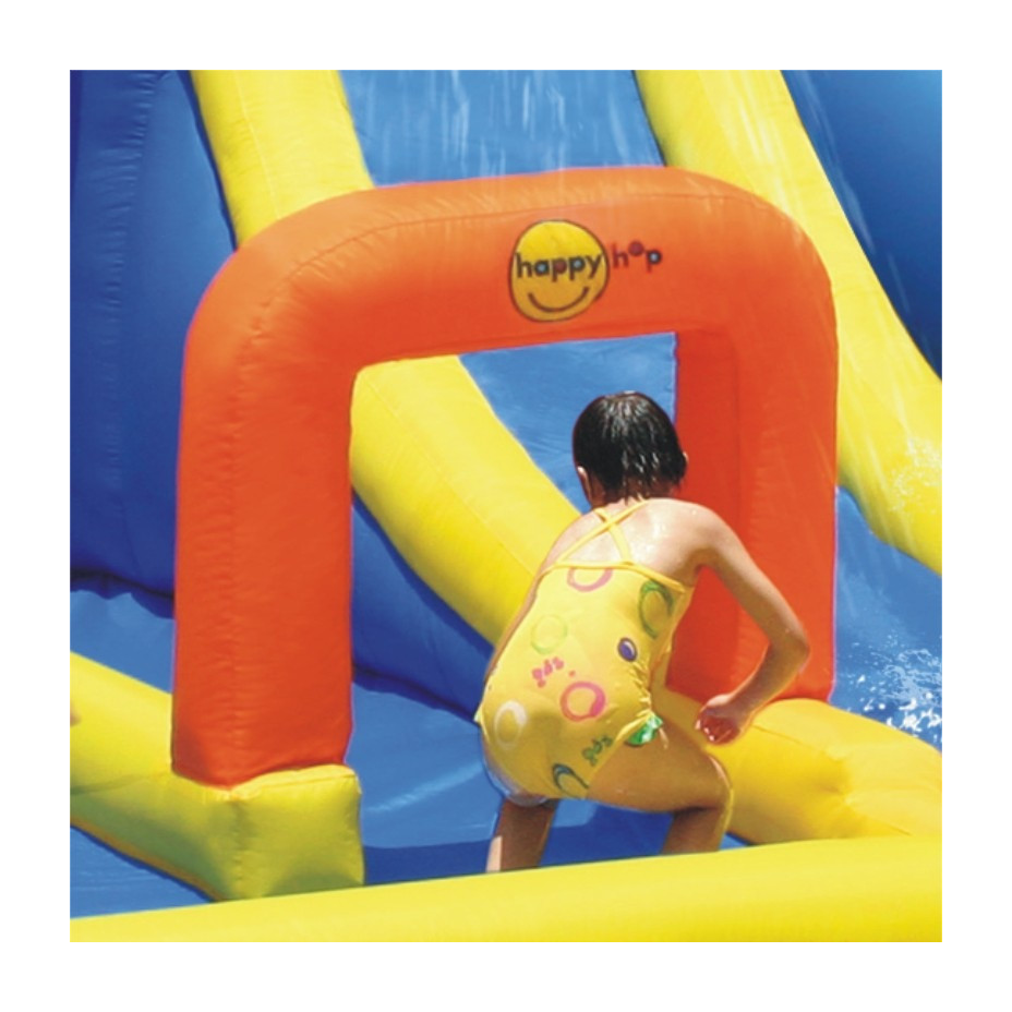 Il Castello gonfiabile Happy Hop "Parco Acquatico" dispone di tre scivoli lunghi, grande superficie per scivolare, ostacoli, tunnel da passare, piscina, corridoi, parete per arrampicata, parete boxing, tunnel, palla canestro, pioli per lancio anelli e tiro a segno (palline con velcro incluse). Il tutto su una vasta superficie, per poter organizzare anche diversi giochi di squadra.