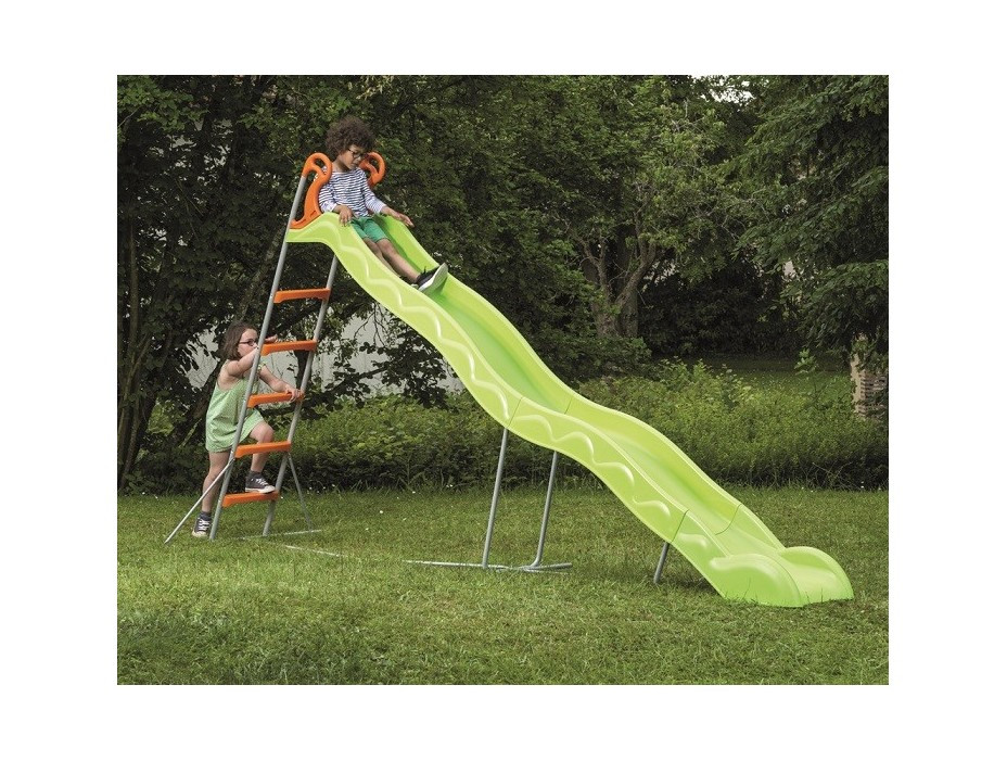 Scivolo in platica colorata da 380 cm di lunghezza, con struttura portante in metallo verniciato e zincato, forma ad onda e completo di scaletta, corrimano, pioli antiscivolo, rinforzo centrale in metallo e terminale in colore diversificato.