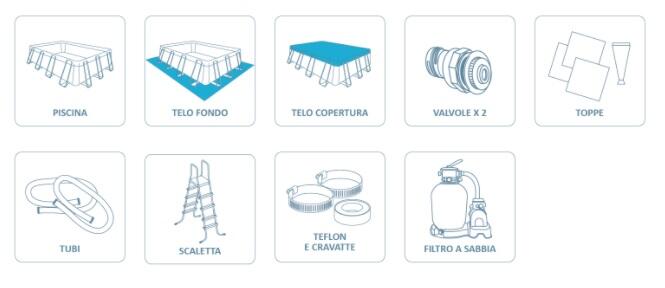 PISCINE FUORI TERRA FRAME: TELO DI COPERTURA PISCINA, TELO SOTTOPISCINA, TOPPE DI RIPARAZIONE TUTTO INCLUSO IN OGNI VERSIONE
