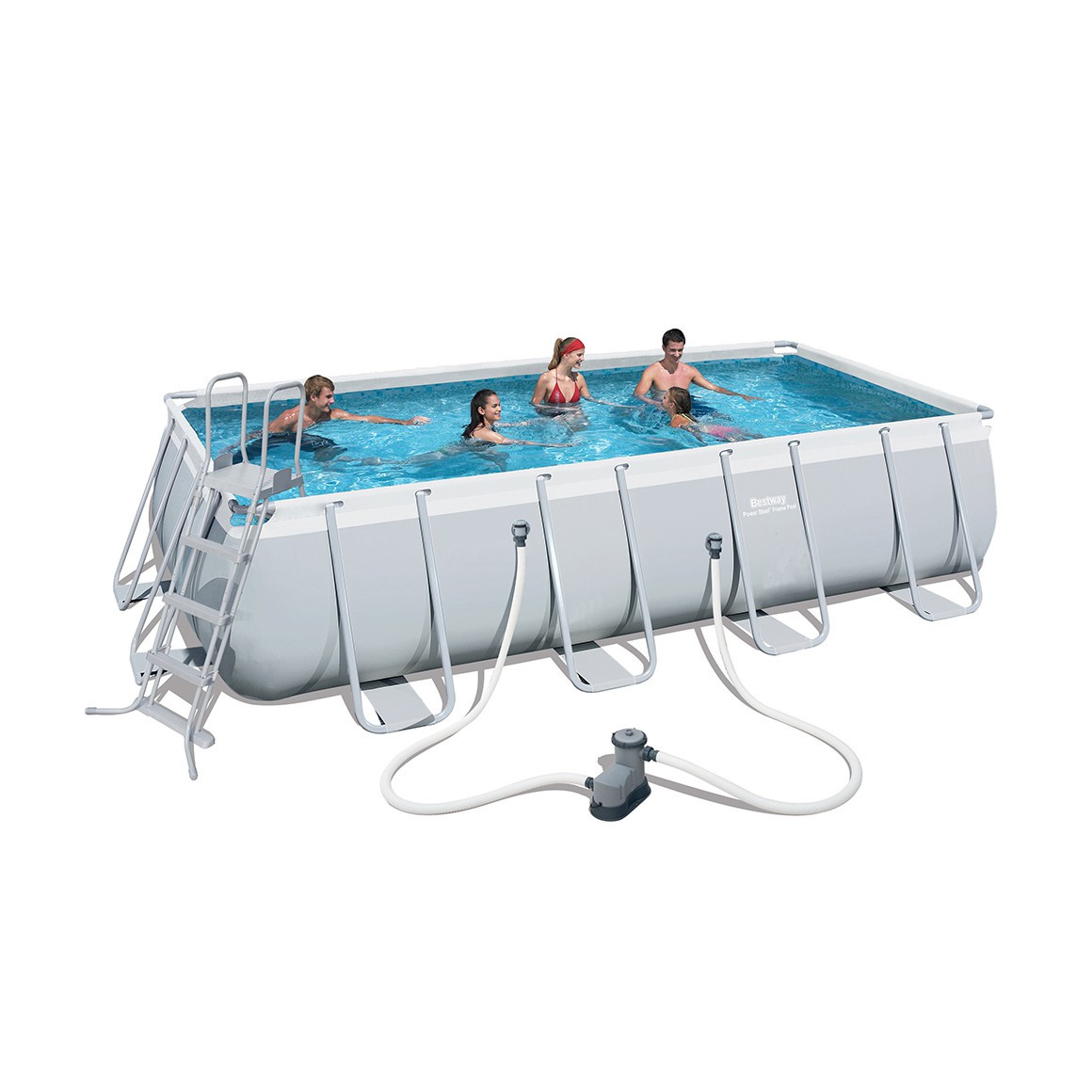 Piscina fuori terra Bestway 56670 rettangolare Power Steel Frame, struttura in metallo galvanizzato antiruggine, il telo che contiene l?acqua detto ?linear? è fatto col ?Triplex?, cioè un tessuto formato da tre strati così suddivisi PVC ? poliestere ? PVC, grazie a questa composizione il triplice strato garantisce una notevolissima resistenza.