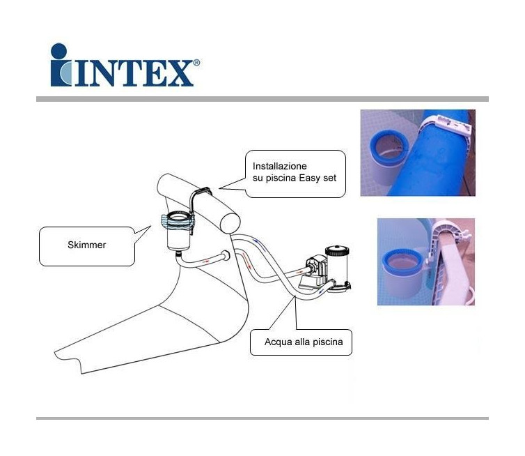 Lo skimmer 28000 funziona come un aspiratore, si attacca alla pompa filtro e pulisce accuratamente (ed automaticamente) la superficie dell'acqua della piscina. Detriti, foglie ed insetti saranno aspirati prima che si depositino sul fondo. Semplice montaggio, gancio universale adatto a tutti i modelli di piscine fuori terra Intex Easy Set, Frame ed UltraFrame, Bestway e similari.