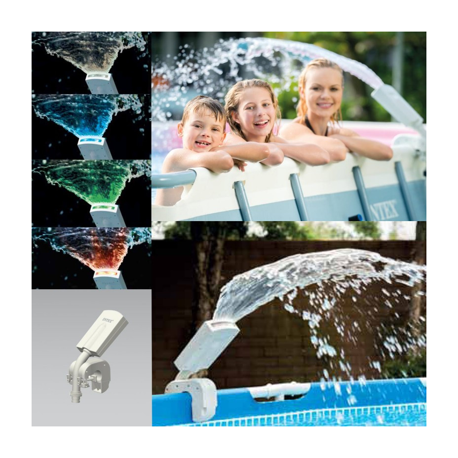 Lo spruzzino intex 28089 è la novità di quest'anno ed è stato realizzato per donare un valore aggiunto alle vostre piscine sia di giorno che di notte, il funzionamento è collegato alla pompa filtro e non è richiesta nessuna presenza di cavi elettrici o di scomode batterie.