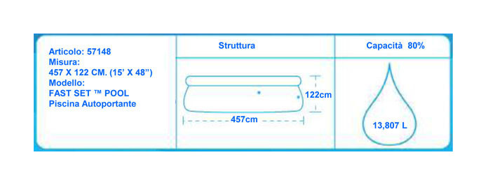 La piscina Bestway Fast Set ha capacità d?acqua al 80% per 13807 litri.