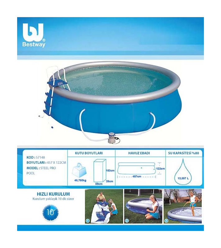 Piscina fuoriterra autoportante circolare. Fast Set Bestway con pompa elettrica filtrante da 3028 l/h, diametro457 cm, altezza 122 cm. Ottime misure ideali per il divertimento di tutta la famiglia. Completa di accessori. Velocissima da preparare e EXTRA resistente.