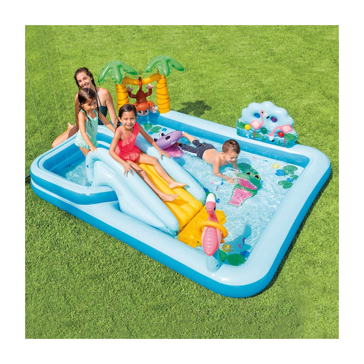 La piscina per bambini Intex 57161 jungle adventure play center è composta da un'ampia vasca rettangolare collegate da uno scivolo e corredata da divertenti giochi.
