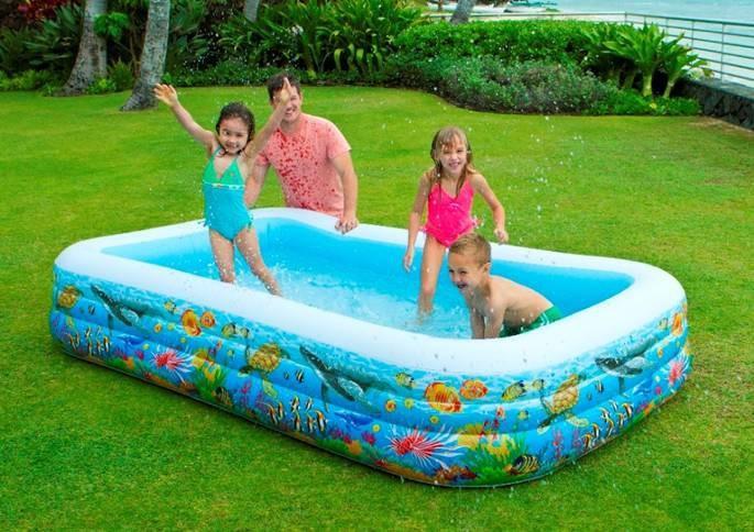 Piscina gonfiabile molto spaziosa, adatta per le famiglie; infatti permette di stare contemporaneamente adulti e bambini. La piscina è facile da usare, facile da spostare e non occupa molto spazio. La piscina di forma rettangolare è realizzata in resistente vinile. Dimensioni: 305 x 183 cm x 56 cm.
