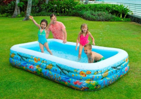 PISCINA FAMILY 305X183X56 cm con fantasia fondale marino, 3 camere d'aria ognuno con valvola combo per rapido gonfiaggio/sgonfiaggio, pareti in I-BEAM che rende la piscina più resistente e confortevole, capacità acqua 999 litri, tappo di scarico, età anni 6+