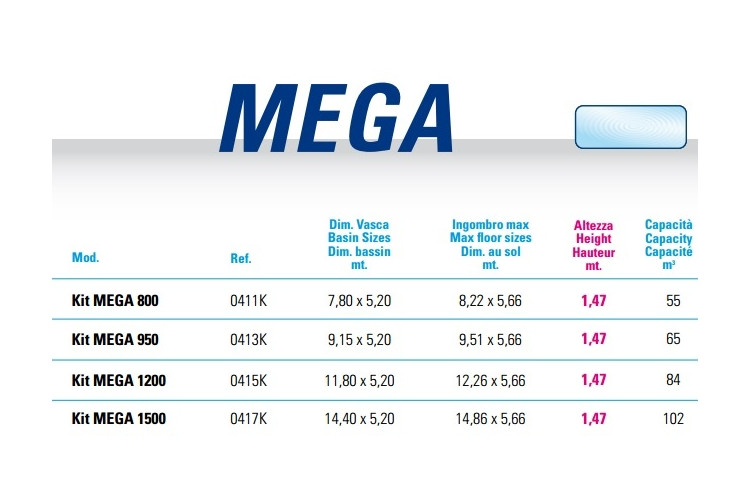MEGA 950è una piscina fuori terra Technypool di dimensioni cm 915X520X147(altezza) e capacità 65 mc. L?ingombro esterno è di cm 951X566X147 (altezza).
