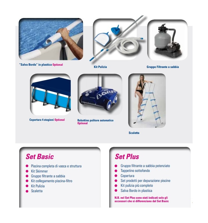 Piscina da giardino completamente made in Italy, completa di kit skimmer fisso (skimmer, bocchette, fascette, teflon), gruppo filtrante a sabbia TF 1200, 3 sacco da 25 kg di sabbia per il filtro, kit di collegamento A (tubazioni, raccorderia). Inoltre la piscina è completa del kit di pulizia EXTRA, comprensivo di canna, asta telescopica e scopa aspirante, oltre alla scaletta step (4+4 gradini con piattaforma).