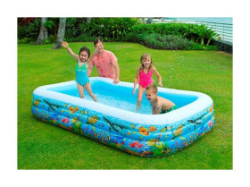 La Piscina gonfiabile rettangolare Swim Center Pesci è perfetta per fare divertire i tuoi bambini in estate. ? prodotta in vinile colorato resistente, spesso 0,33 mm, con simpatica stampa multicolore a tema fondo oceanico con creature marine. Dotata di tre anelli gonfiabili resistenti con tecnologia I-beam. Si gonfia e sgonfia velocemente, grazie alla pratica valvola; è dotata di tre camere d?aria. Dimensioni: 305x183x56 cm. Capacità d?acqua al livello di riempimento suggerito di 36 cm: 1050 litri. Toppa di riparazione inclusa. Tappo di scarico. Età: 6+ anni.