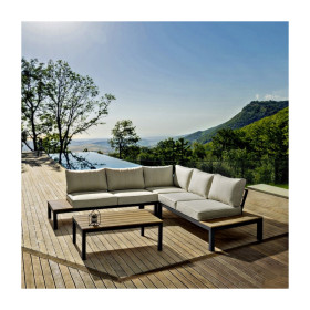 Struttura in alluminio verniciato a polvere (poliestere). Braccioli delle sedute e piano tavolino in polywood (materiale composito dall?aspetto simile al legno) 90% polistirene 10% SBS color teak. Cuscini sfoderabili con tessuto in polyestere. Viteria in acciaio galvanizzato.