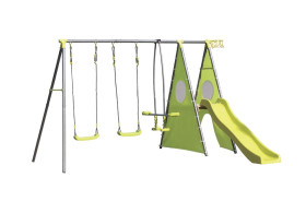 STRUTTURA IN ACCIAIO VERNICIATO A POLVERE EPOSSIDICA. SEDUTE, ALIANTE, SCIVOLO IN PLASTICA. ASTA ORIZZONTALE ?50mm. GAMBE ?45mm. 2 SEDUTE. 1 ALIANTE. 1 SCIVOLO (LUNGHEZZA 1,78m). CORDA IN PE, ?10mm. 1 CANESTRO BASKET. PANNELLI LATERALI SCIVOLO IN POLYESTERE (180 G/M²), PIANO IN LEGNO. PRODOTTO DA ASSEMBLARE. CAPACITA' MASSIMA ALTALENA: 50KG, CAPACITA' MASSIMA CAVALLUCCIO SCIVOLO E CAVALLUCCIO: 35KG ETA': 3-12 ANNI