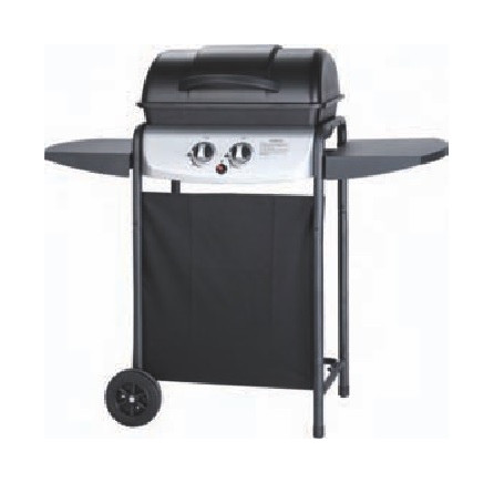 Barbecue YUMA. Griglia smaltata cm. 49 ? 32. Bruciatori in alluminio a gas a fiamma stabilizzata. Potenza 4,9 kw. Accensione piezoelettrica. Coperchio in acciaio verniciato. Piani laterali in acciaio. Telo anteriore in tessuto. Con 2 ruote.