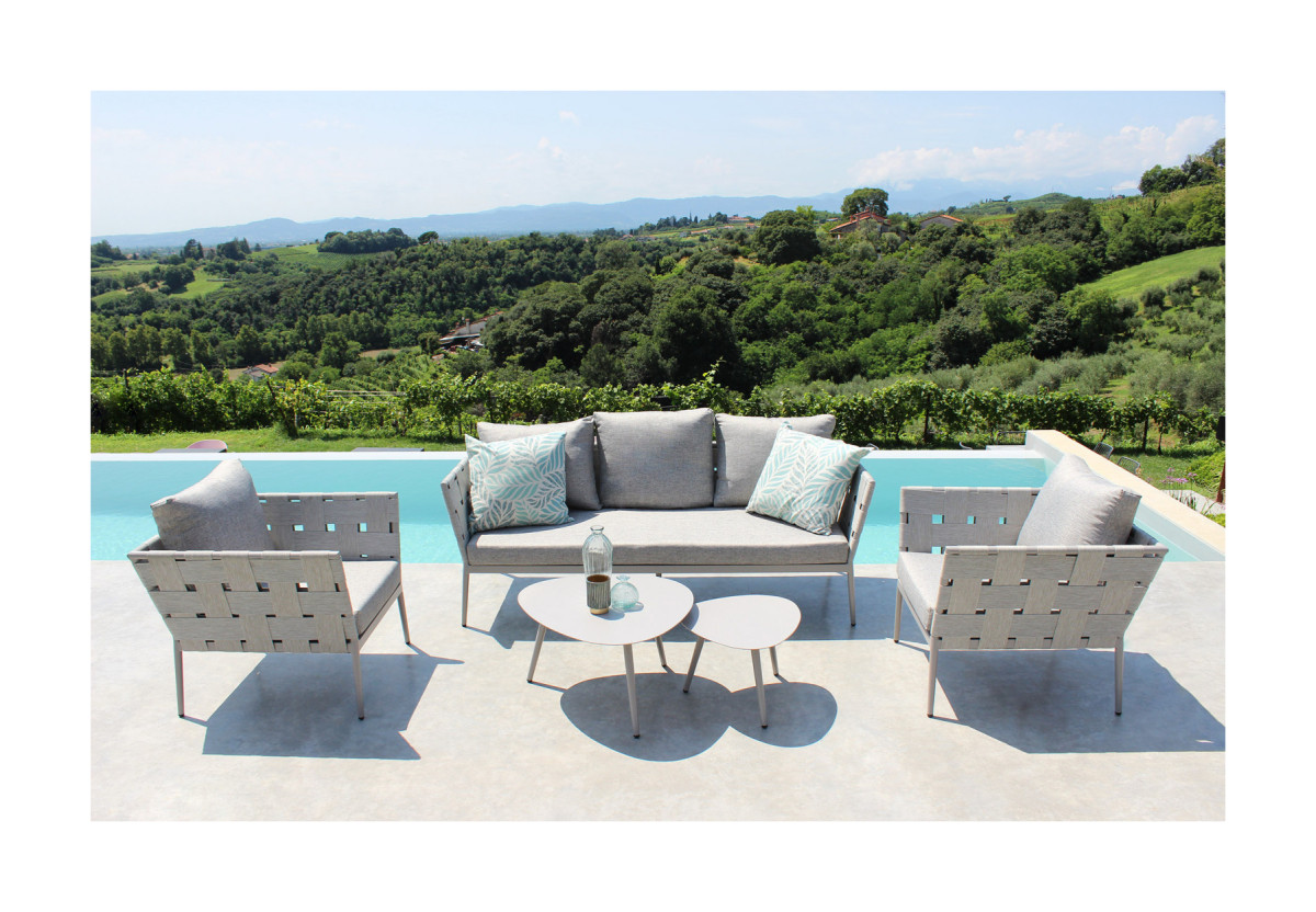 Il terrazzo è un luogo da sfruttare dove poter godersi a pieno le sue potenzialità, per questo nasce questo salottino da esterni dalle linee moderne realizzato in alluminio e ricoperto da morbidi cuscini.