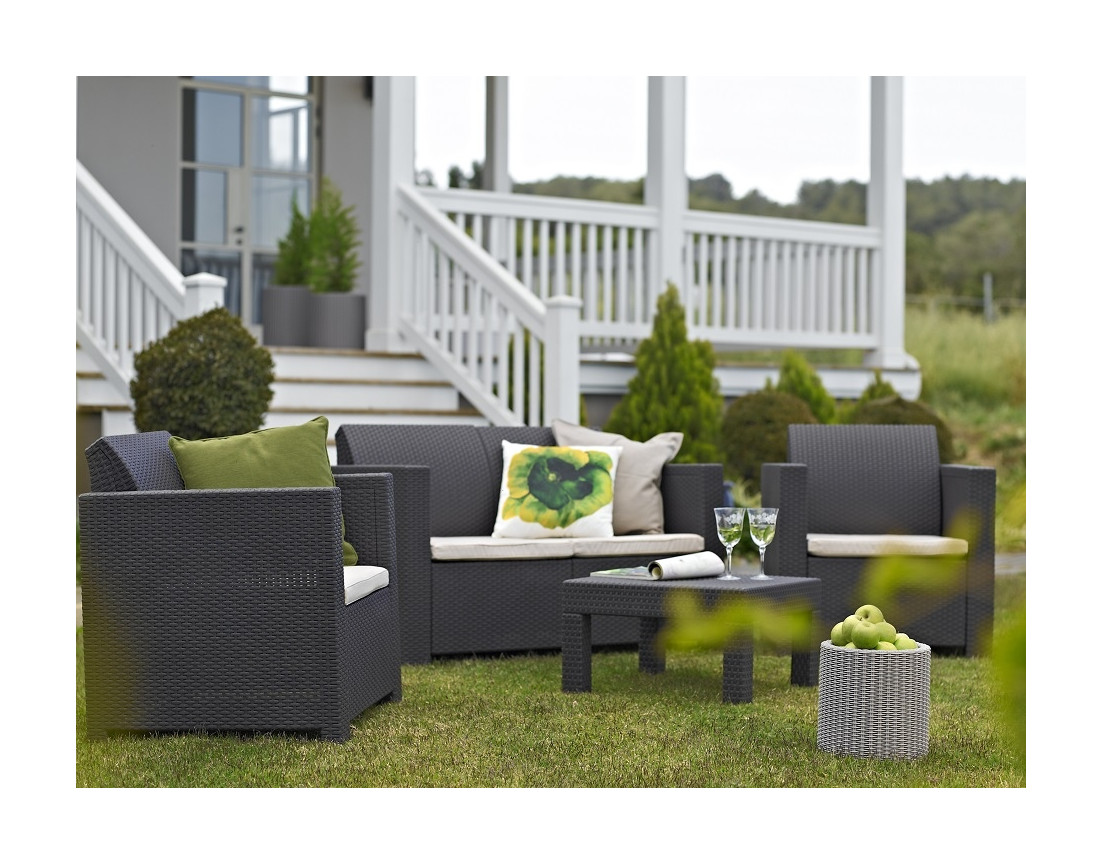 Set da giardino della Keter mod. Colorado Bellissimo Salottino del famoso marchio italiano Keter, composto da divano a due posti, due comode poltrone e tavolino. Completa il tutto cuscini nel colore scuro. Il prodotto viene spedito da assemblare: 1 Divano 3 posti. misure:cm 2 Poltroncine misura cm Tavolino rettangolare cm peso: 50 kg colori disponibili antracite cuscini sfoderabili di cotone